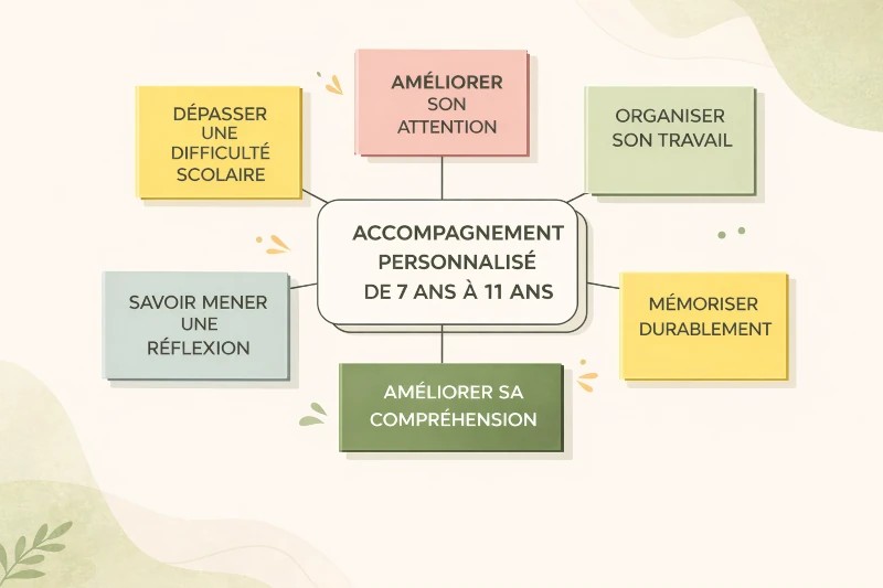 L’objectif n’est pas de refaire les devoirs, mais d’aider l’enfant à comprendre comment il apprend, pour qu’il puisse ensuite réutiliser ces stratégies seul, en classe comme à la maison.